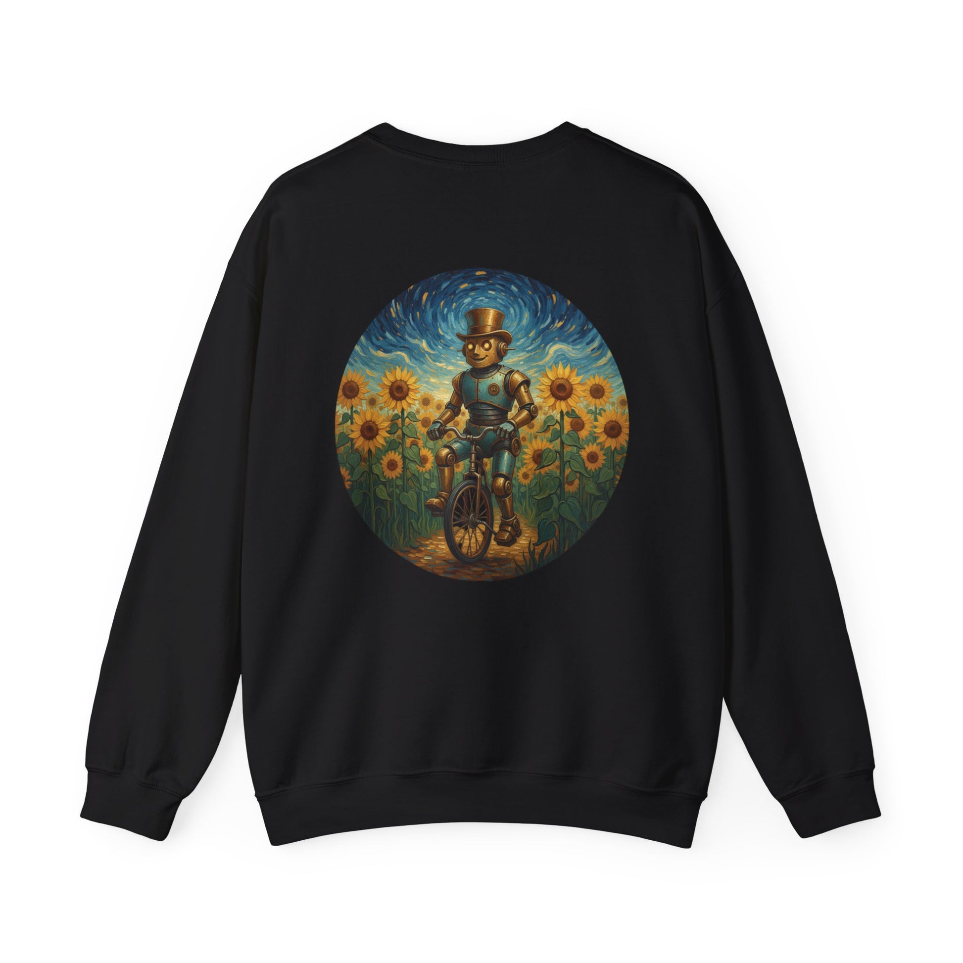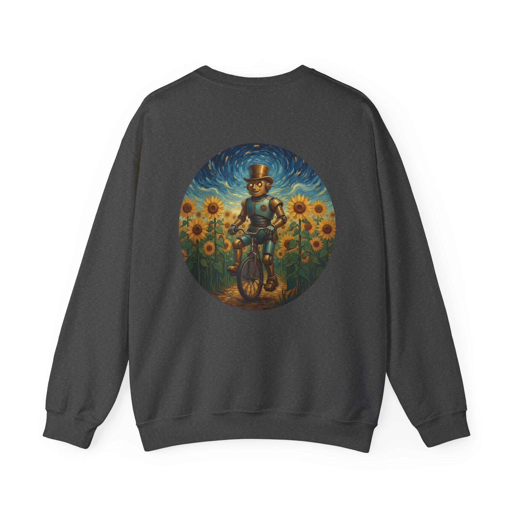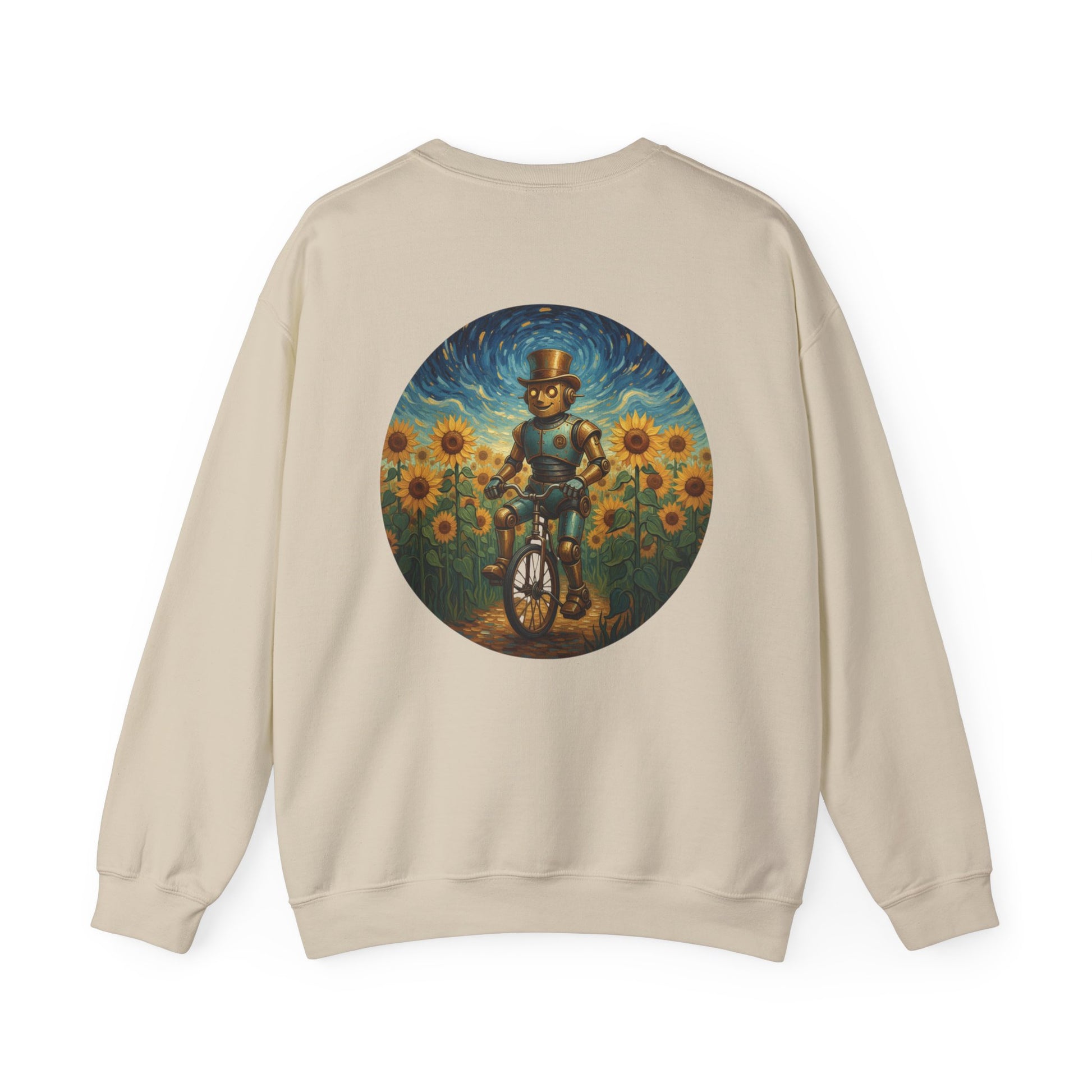 This cozy crewneck brings gentle nostalgia with a modern twist — a soft white sweatshirt printed with playful front lettering and a bold, artful back illustration. Slip it on when you want warmth without weight: the mid‑heavy cotton-poly blend feels lived-in from the first wear and holds its shape through chilly commutes, slow café mornings, or evenings by the fire pit. The front keeps things minimal and cheeky with a wintery snowflake and bold numbers, while the full‑back circular art turns heads with rich sunflowers and a whimsical, top‑hatted cyclist. It’s built to be worn often: reinforced seams at the shoulders and cuffs keep the silhouette clean, tear‑away tags remove itch, and responsibly sourced materials and OEKO‑TEX dyes mean comfort you can feel good about.